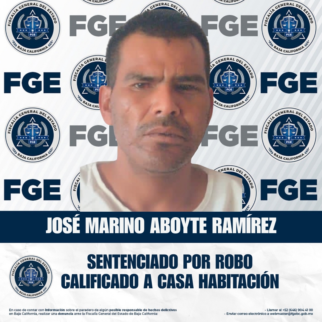 ENSENADA, BAJA CALIFORNIA. - La Fiscalía Regional de Ensenada, a través de la Unidad de Investigación de Robos, obtuvo una sentencia condenatoria de 5 años y 8 meses de prisión contra José Marino Aboyte Ramírez por el delito de robo calificado a casa habitación.