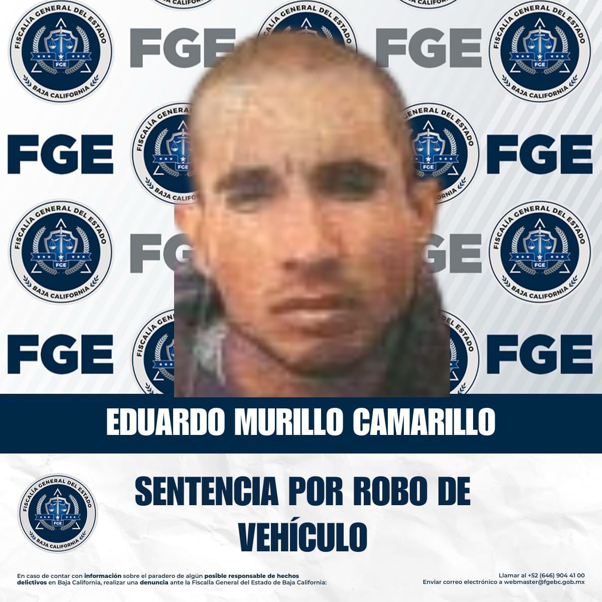 TIJUANA, BAJA CALIFORNIA. -  La Fiscalía Regional de Tijuana, a través de la Unidad de Investigación de Robo de Vehículos, obtuvo sentencia condenatoria en contra de Eduardo Murillo Camarillo, por su responsabilidad en el delito de robo de vehículo de motor en la modalidad de posesión.