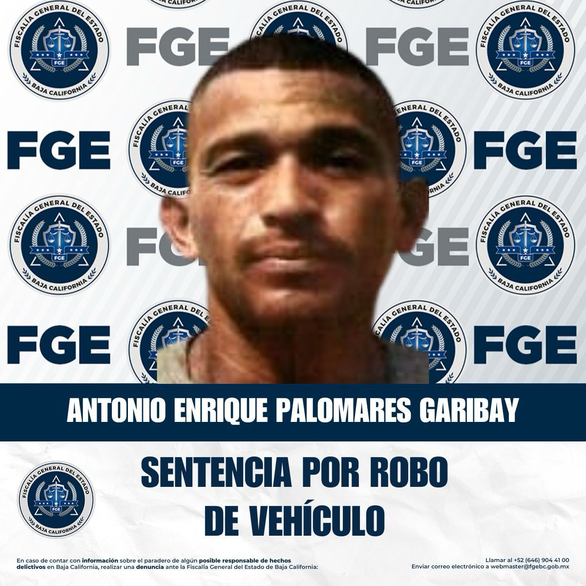 TIJUANA, BAJA CALIAFORNIA. - La Fiscalía Regional de Tijuana, a través de la Unidad de Investigación de Robo de Vehículos, logró que se dictara sentencia condenatoria en contra de Antonio Enrique Palomares Garibay, por su responsabilidad en el delito de robo equiparado de vehículo de motor en la modalidad de poseer.