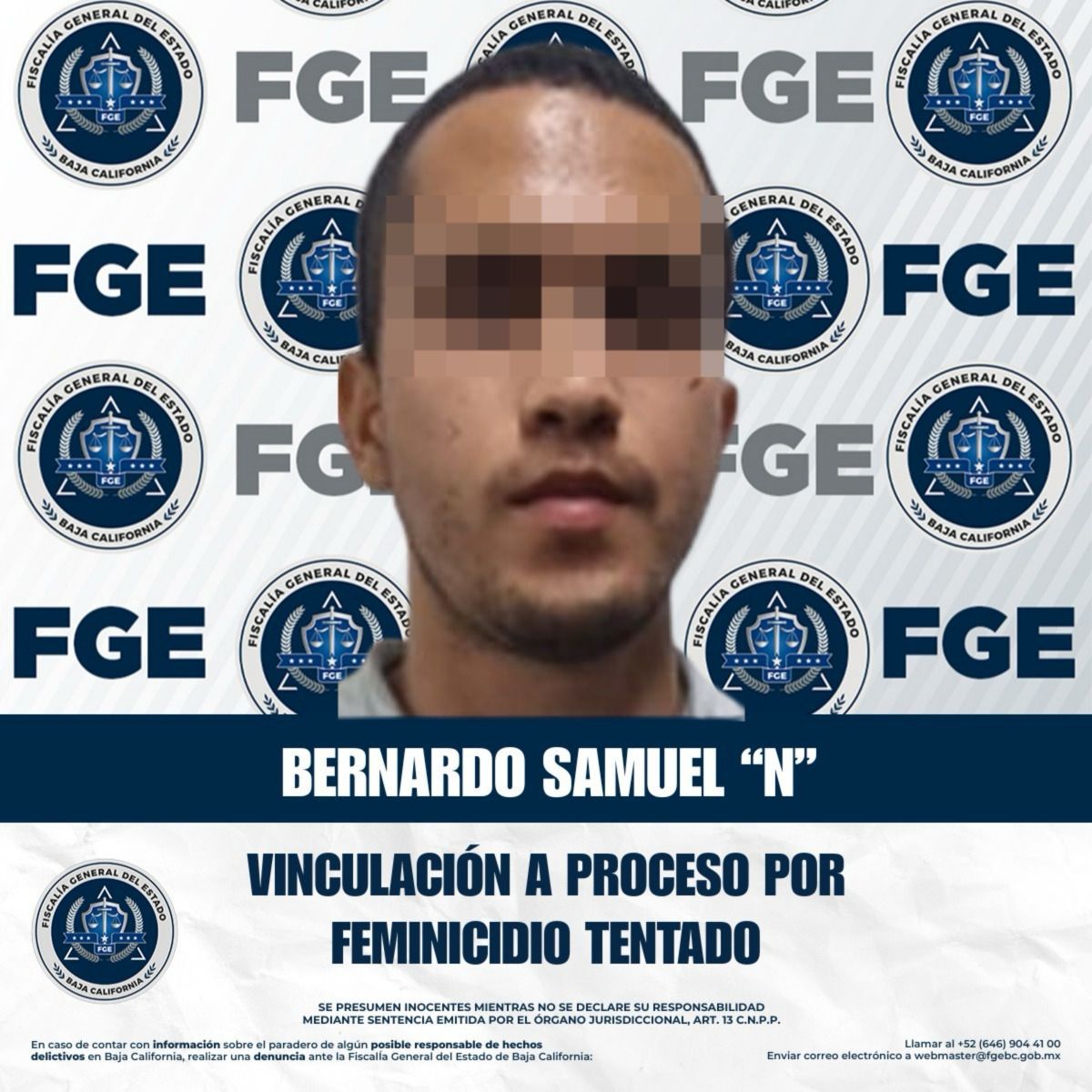 TIJUANA, BAJA CALIFORNIA. - La Fiscalía Regional de Tijuana, a través de la Unidad de Investigación con Detenido, obtuvo la vinculación a proceso de Bernardo Samuel “N”, por su presunta responsabilidad en el delito de feminicidio tentado.