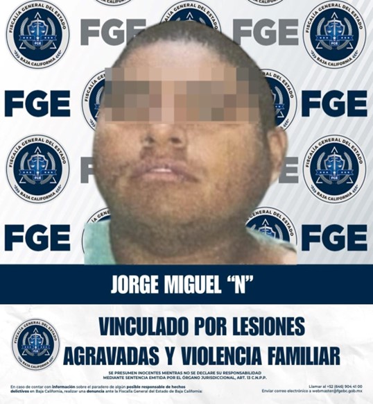 TIJUANA, BAJA CALIFORNIA. - La Fiscalía Regional de Tijuana, a través de la Unidad de Investigación con Detenidos, logró la vinculación a proceso de Jorge Miguel “N” por el delito de lesiones agravadas por razón del parentesco y violencia familiar en sus vertientes física y psicológica. El imputado fue detenido por su presunta responsabilidad en los hechos ocurridos el pasado 11 de septiembre de 2025, alrededor de las 09:20 horas, en un domicilio ubicado en la colonia Granjas Buenos Aires.
