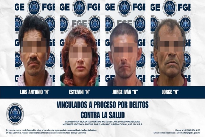 TIJUANA, BAJA CALIFORNIA. - La Fiscalía General del Estado informa que cuatro imputados por delitos contra la salud en la modalidad de narcomenudeo, fueron vinculados a proceso penal, luego de que los elementos de prueba presentados por el Ministerio Público fueron suficientes para que los jueces de control determinaran iniciar el proceso en su contra.