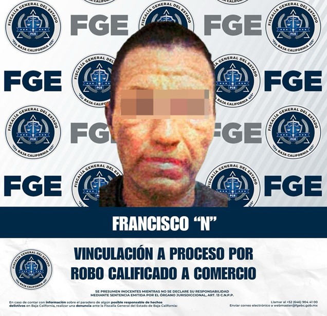 TIJUANA, BAJA CALIFORNIA. - La Fiscalía Regional de Tijuana logró la vinculación a proceso de Francisco “N” por el delito de robo calificado a comercio abierto al público ejecutado con violencia.