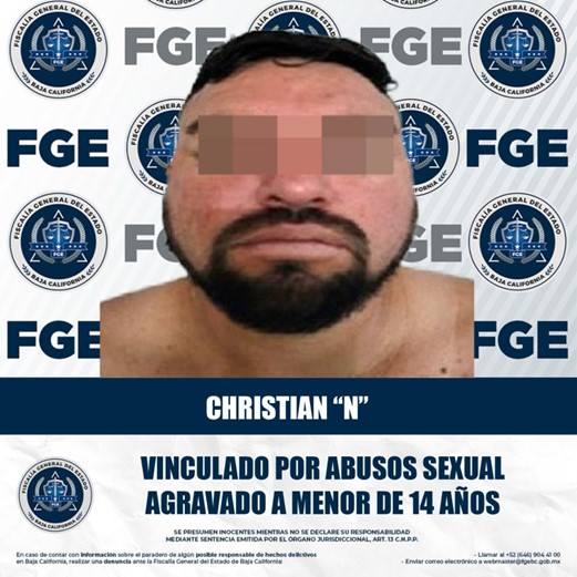MEXICALI, BAJA CALIFORNIA. - Con base en los elementos de prueba presentes en la carpeta de investigación, la Fiscalía Regional de Mexicali logró la vinculación a proceso de un hombre acusado por el delito de abuso sexual agravado a menor de 14 años.