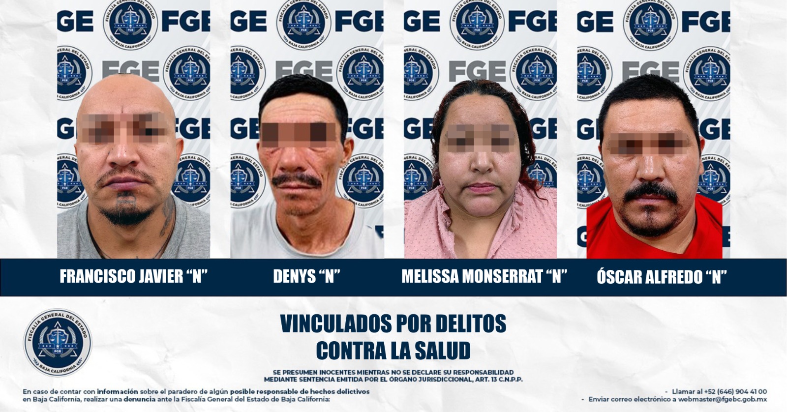 MEXICALI, BAJA CALIFORNIA. - Como resultado del combate a la venta y distribución de droga, la Fiscalía General del Estado (FGE), a través de la Fiscalía Especializada en Narcomenudeo, logró que cuatro presuntos narcomenudistas fueran vinculados a proceso con diversas medidas cautelares.