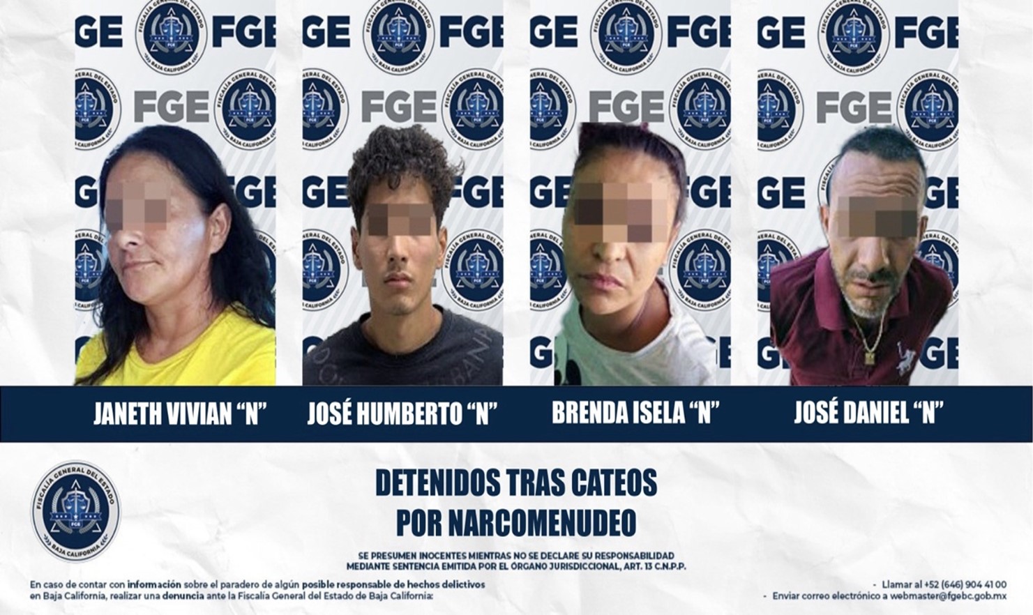 MEXICALI, BAJA CALIFORNIA. - La Fiscalía General del Estado, a través de la Fiscalía Especializada en Narcomenudeo, ejecutó dos cateos en la colonia Baja California, logrando la detención de cuatro personas, el aseguramiento de droga y de los inmuebles donde operaban presuntas “tienditas”.