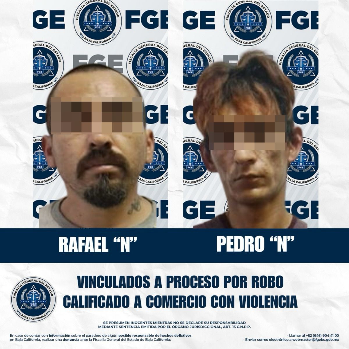 TIJUANA, BAJA CALIFORNIA. - La Fiscalía Regional de Tijuana, a través de la Unidad de Investigación con Detenido, obtuvo la vinculación a proceso en contra de dos individuos en casos diversos por el delito de robo calificado cometido en establecimiento comercial con violencia, imponiéndose a ambos la medida cautelar de prisión preventiva justificada.