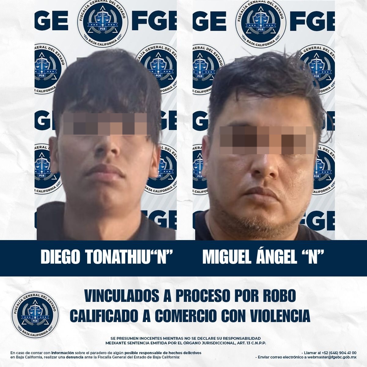 TIJUANA, BAJA CALIFORNIA. - La Unidad de Investigación con Detenido, adscrita a la Fiscalía Regional de Tijuana, obtuvo la vinculación a proceso en contra de Diego Tonathiu “N” y Miguel Ángel “N”, por el delito de robo calificado cometido en contra de un comercio abierto al público, ejecutado con violencia.