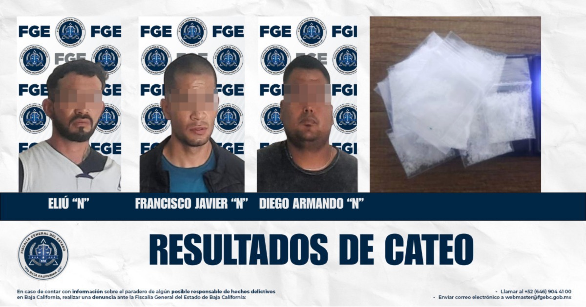 Durante la intervención, fueron detenidos Eliú “N”, Francisco Javier “N” y Diego Armando “N”, a quienes se les encontraron 15 bolsitas de plástico con una sustancia granulada al tacto, al parecer metanfetamina. El inmueble fue asegurado como parte de la investigación en curso.