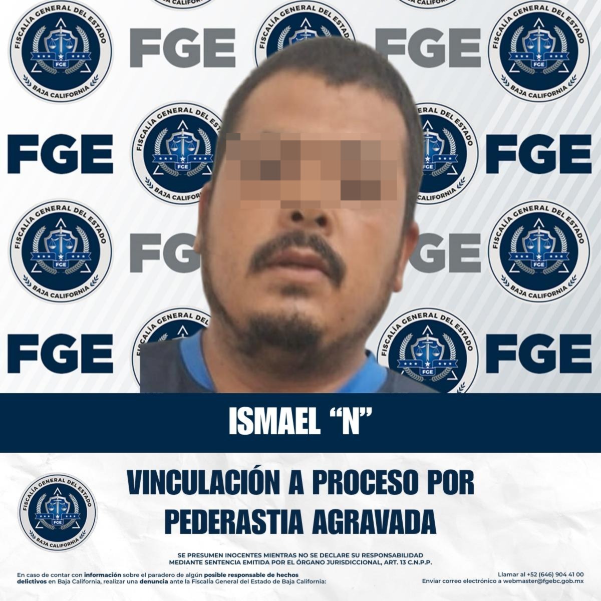 TIJUANA, BAJA CALIFORNIA. - La Fiscalía General del Estado bajo las directrices de la titular, Dra. Ma. Elena Andrade Ramírez, de presentar ante la justicia a todo aquel que cometa algún delito contra las mujeres en Baja California, se logró la vinculación a proceso en contra de Ismael “N” por el delito de pederastia agravada, gracias a las labores de la Unidad de Investigación Especializada en Delitos Sexuales, Adscrita a la Fiscalía Especializada en Delitos contra Mujeres Por Razón de Género.