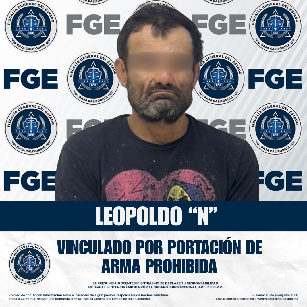 SAN QUINTÍN, BAJA CALIFORNIA. - La Fiscalía Regional de San Quintín obtuvo la vinculación a proceso de Leopoldo “N” por el delito de portación de arma prohibida, tras ser detenido por elementos de la Policía Municipal en el fraccionamiento San Quintín.