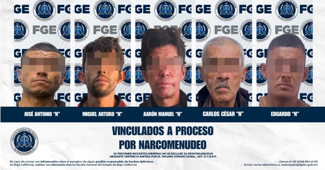 TIJUANA, BAJA CALIFORNIA. - La Fiscalía General del Estado informa que cinco personas fueron vinculadas a proceso penal por delitos contra la salud, en la modalidad de narcomenudeo. La determinación judicial se emitió luego de que los elementos de prueba presentados por el Ministerio Público de la Fiscalía Especializada en Narcomenudeo resultaran suficientes para acreditar la probable responsabilidad de los imputados.