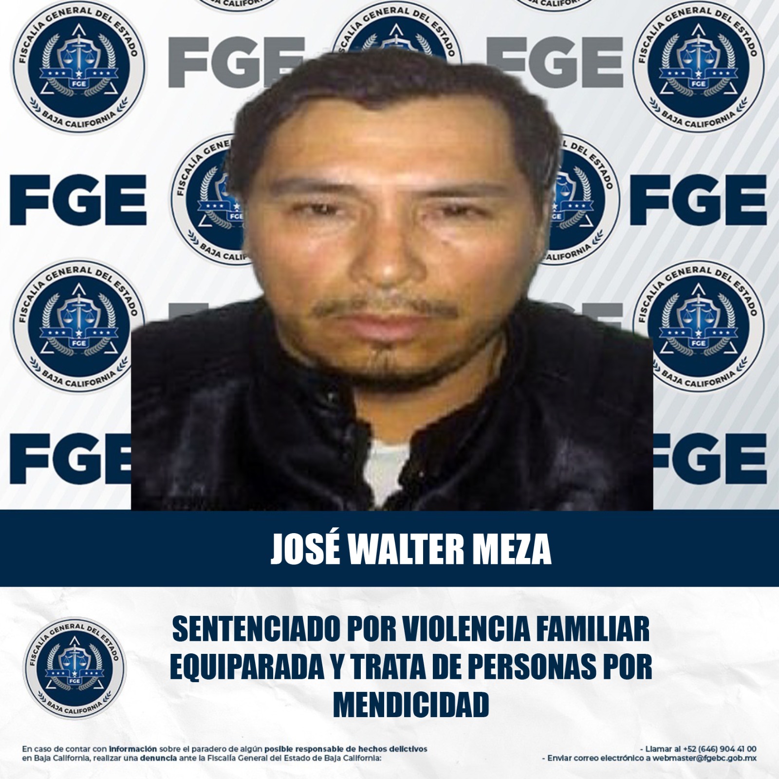 MEXICALI, BAJA CALIFORNIA. - La Fiscalía Regional de Mexicali, a través de la Unidad de Investigación con Detenidos Oriente, obtuvo sentencia condenatoria contra José Walter Meza, responsable de los delitos de violencia familiar y trata de personas por mendicidad.