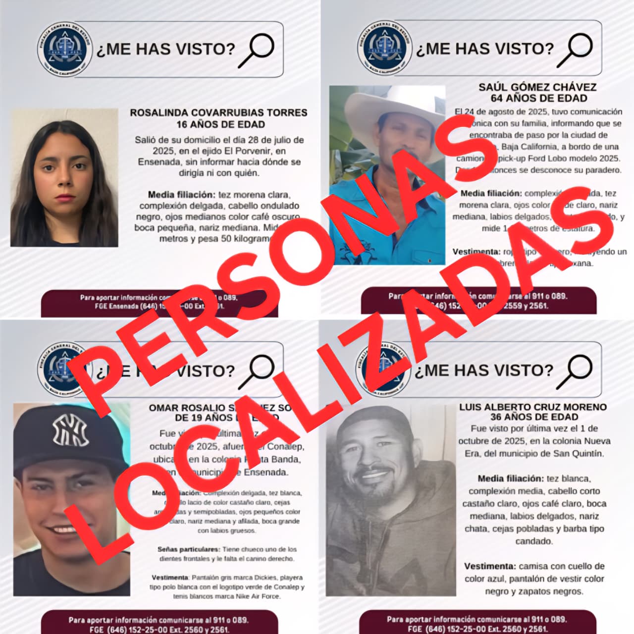 ENSENADA, BAJA CALIFORNIA. - La Fiscalía General del Estado informa la localización con bien de cuatro personas que contaban con reporte de desaparición en el municipio de Ensenada, entre ellas una menor de edad.