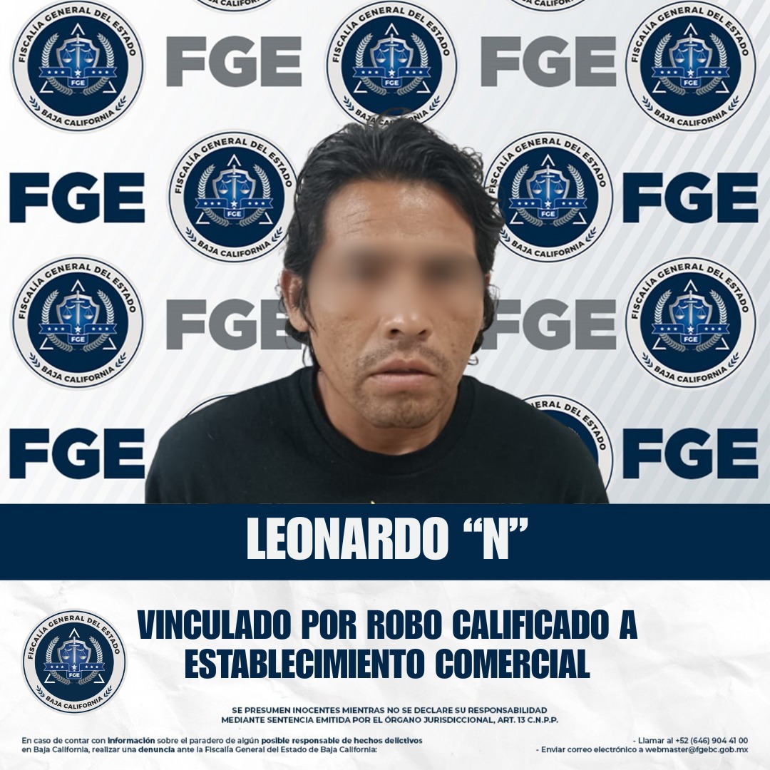 ENSENADA, BAJA CALIFORNIA. - Por su presunta participación en el robo de 37 mil pesos en efectivo a un comercio, un sujeto identificado como Leonardo “N” fue vinculado a proceso penal y enviado a prisión preventiva justificada, informó la Fiscalía Regional de Ensenada.