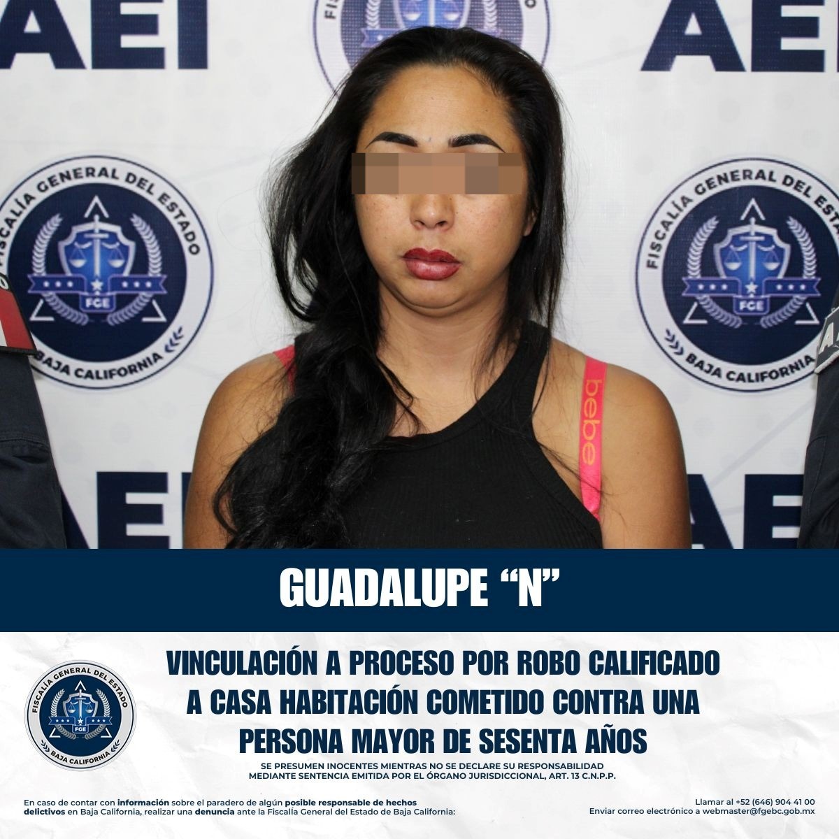TIJUANA, BAJA CALIFORNIA - La Unidad de Investigación Especializada en Robos, Zona Centro, adscrita a la Fiscalía Regional de Tijuana, obtuvo la vinculación a proceso y la medida cautelar de prisión preventiva oficiosa en contra de Guadalupe “N”, por el delito de robo calificado a casa habitación cometido contra una persona mayor de sesenta años.