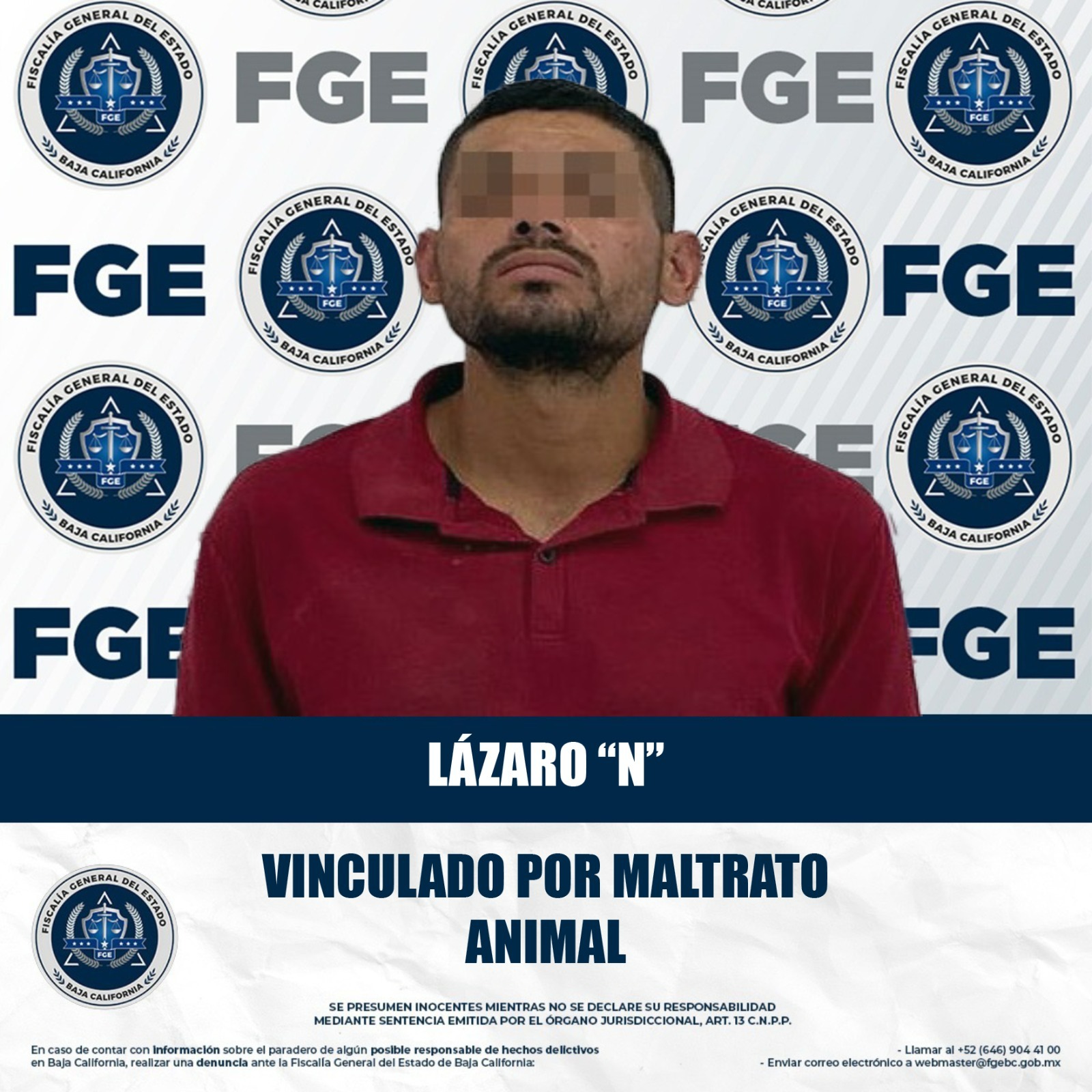 MEXICALI, BAJA CALIFORNIA. - La Fiscalía Regional de Mexicali, en coordinación con la Fiscalía Especializada en Delitos Ambientales y Contra los Animales, obtuvo la vinculación a proceso de Lázaro “N”, por su probable responsabilidad en el delito de maltrato o crueldad animal.