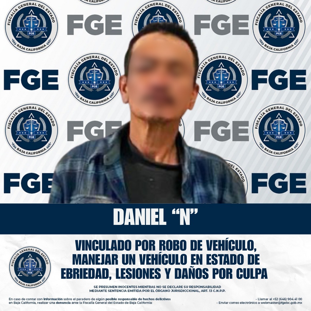 ENSENADA, BAJA CALIFORNIA. - La Fiscalía Regional de Ensenada informa que se obtuvo la vinculación a proceso de Daniel “N” por su probable responsabilidad en los delitos de robo de vehículo, manejar un vehículo en estado de ebriedad, lesiones por culpa y daños en propiedad ajena por culpa, tras un incidente registrado el pasado 16 de octubre de 2025 en el poblado de Maneadero.