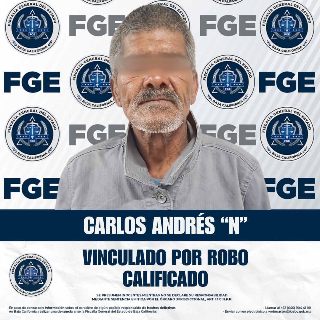 ENSENADA, BAJA CALIFORNIA. - La Fiscalía Regional de Ensenada, a través de la Unidad de Control con Detenido, logró la vinculación a proceso de Carlos Andrés “N” por el delito de robo calificado.