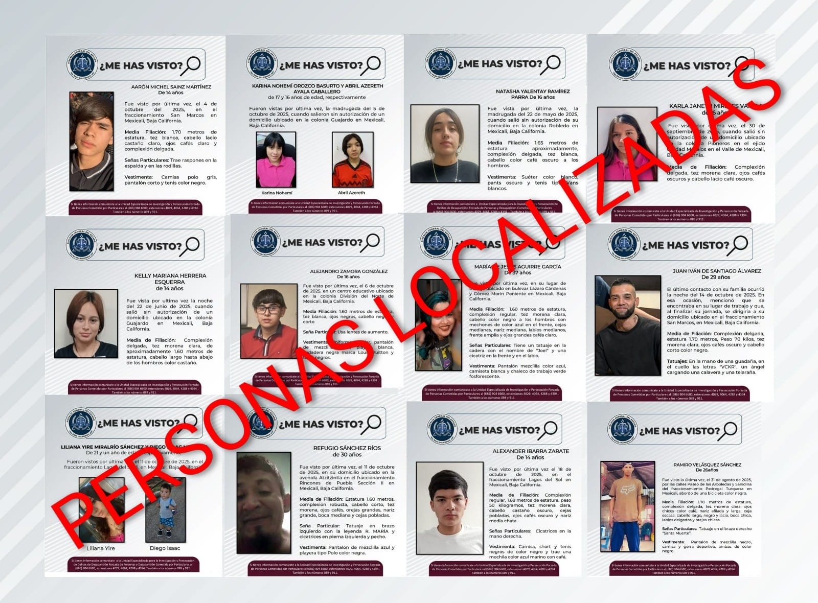 MEXICALI, BAJA CALIFORNIA. - La Fiscalía General del Estado de Baja California, a través de la Unidad Especializada para la Investigación y Persecución de Delitos de Desaparición Forzada y Desaparición Cometida por Particulares, informa que fueron localizadas catorce personas que contaban con reporte de búsqueda.