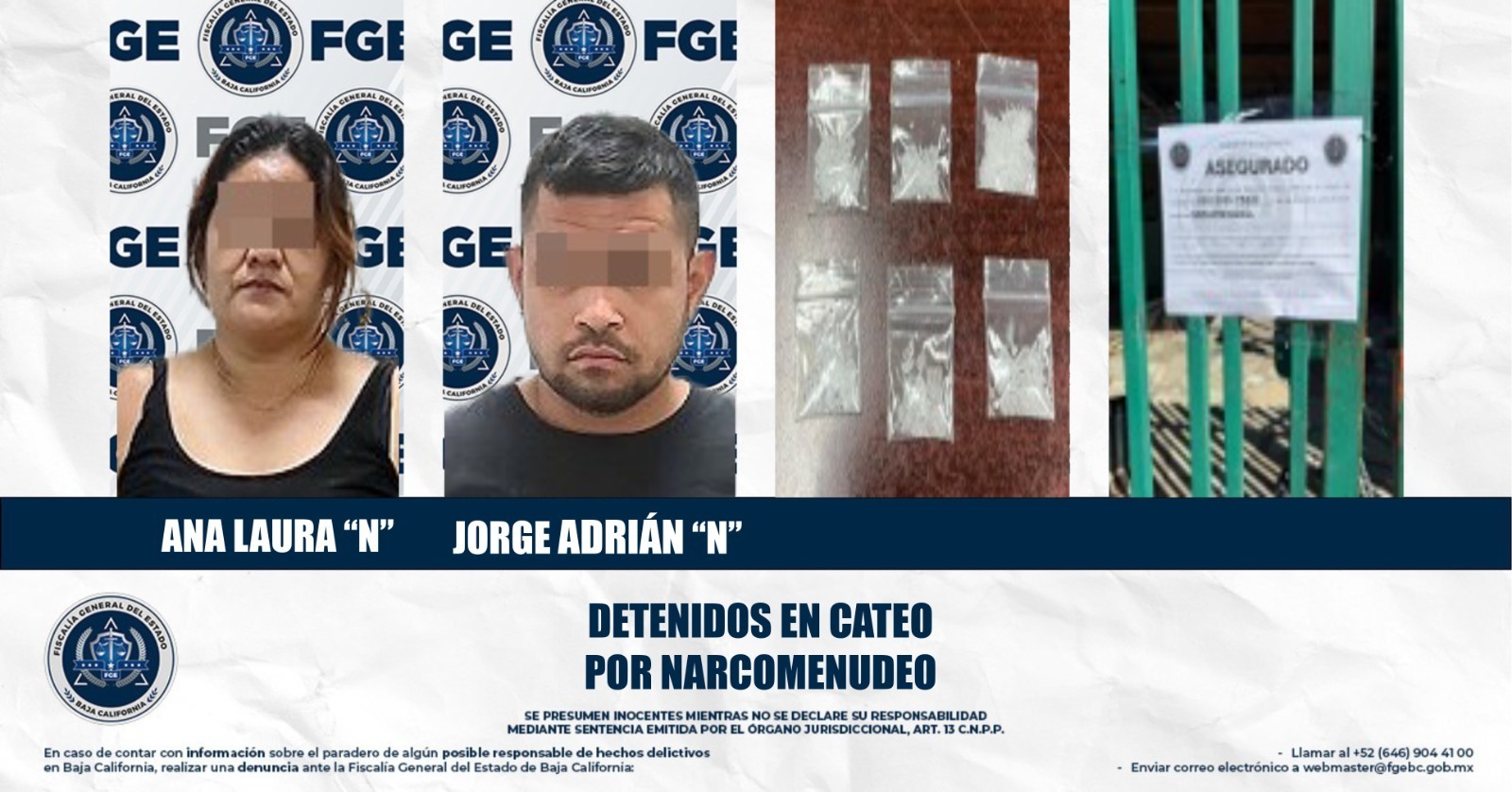 Durante el operativo se logró la detención de Ana Laura “N” y Jorge Adrián “N”, así como el decomiso de narcóticos, en los que destacan seis bolsas de plástico que contenían una sustancia granulada al tacto con las características de la droga conocida como metanfetamina, además se aseguró el inmueble.