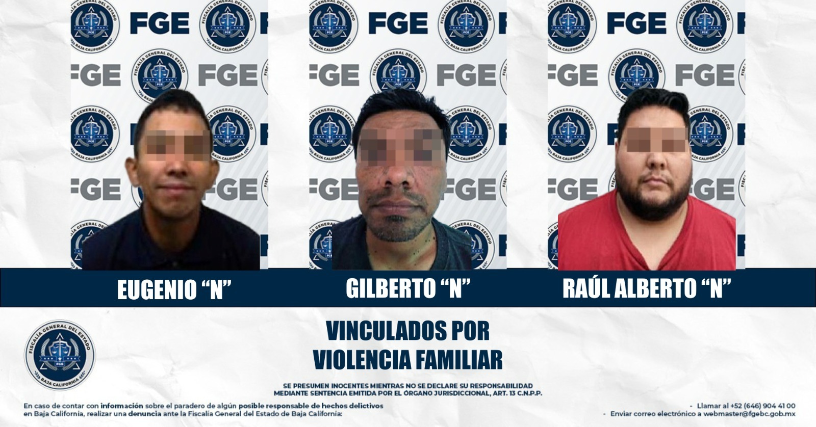 MEXICALI, BAJA CALIFORNIA. - La Fiscalía Regional de Mexicali obtuvo la vinculación a proceso de tres hombres por el delito de violencia familiar, tras acreditar con pruebas sólidas su presunta responsabilidad en agresiones cometidas en contra de sus familiares.