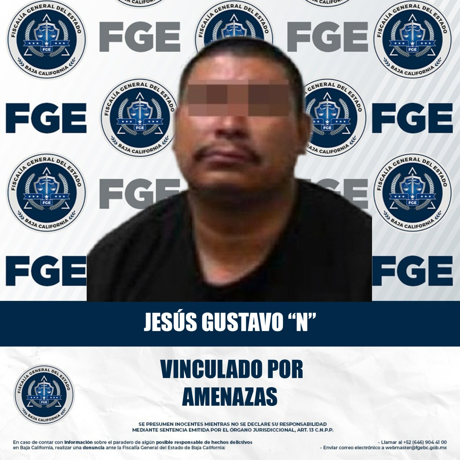 MEXICALI, BAJA CALIFORNIA. - La Fiscalía Regional de Mexicali, a través de la Unidad de Investigación con Detenidos Poniente, obtuvo la vinculación a proceso de Jesús Gustavo “N”, por su presunta responsabilidad en el delito de amenazas.