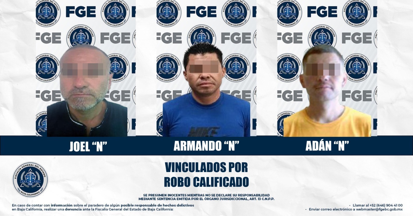 MEXICALI, BAJA CALIFORNIA. - La Fiscalía Regional de Mexicali, a través de la Unidad de Investigación de Delitos de Robo Oriente, Robo Poniente, y Detenidos Poniente, obtuvo la vinculación a proceso de tres hombres imputados por el delito de robo calificado.
