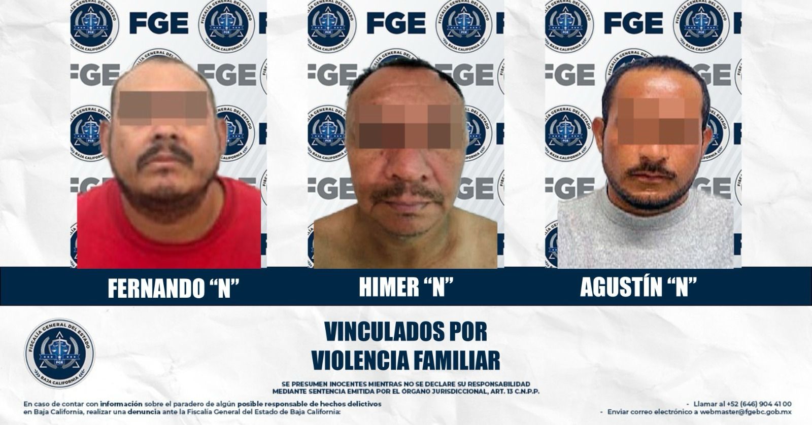 MEXICALI, BAJA CALIFORNIA. - La Fiscalía Regional de Mexicali, a través de las unidades de Investigación de Delitos con Detenidos Poniente, Detenidos Oriente y la Foránea Guadalupe Victoria, obtuvo la vinculación a proceso de tres hombres imputados por el delito de violencia familiar.