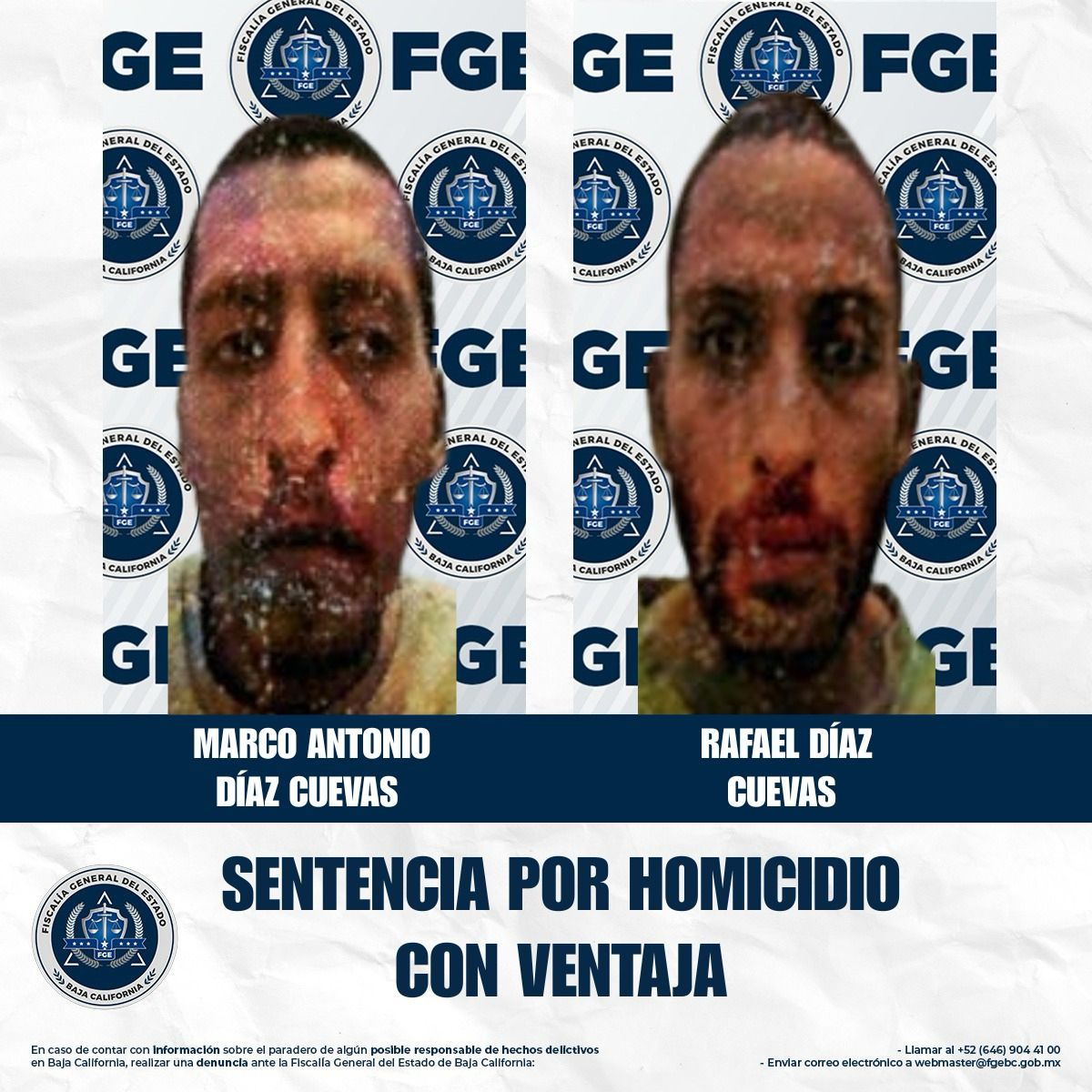 TIJUANA, BAJA CALIFORNIA. - La Fiscalía Regional de Tijuana, a través de la Coordinación de Averiguaciones Previas y Control de Proceso, logró que fueran sentenciados Marco Antonio Díaz Cuevas, alias “El Malo”, y Rafael Díaz Cuevas, alias “El Primo”, a 23 años y nueve meses de prisión, luego de que se acreditó su responsabilidad en el delito de homicidio calificado con ventaja.