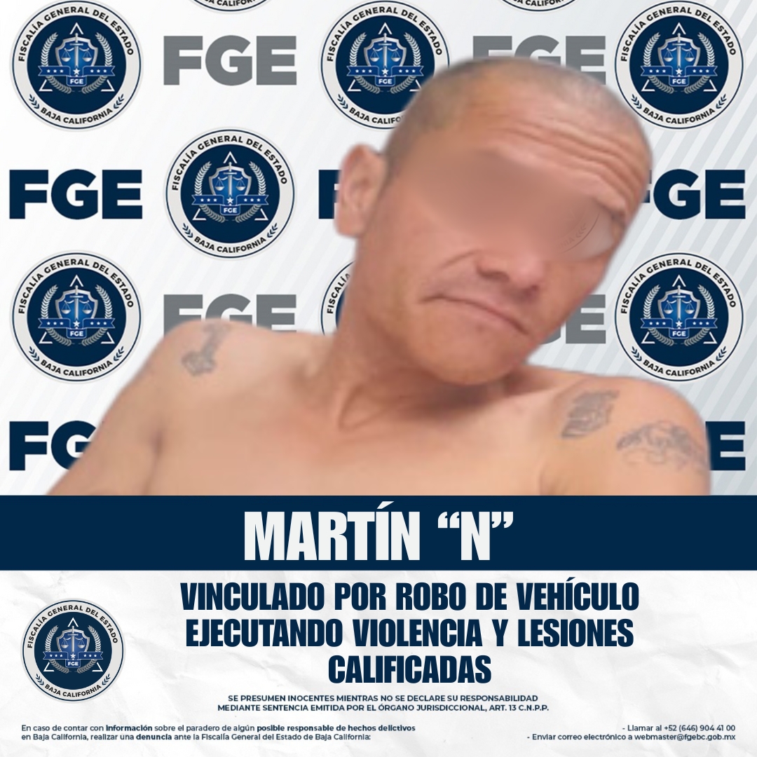ENSENADA, BAJA CALIFORNIA. - La Fiscalía Regional de Ensenada, a través de la Unidad de Investigación de Robo de Vehículos, logró la vinculación a proceso de Martín “N”, por su presunta responsabilidad en los delitos de robo de vehículo ejecutado con violencia y lesiones calificadas.