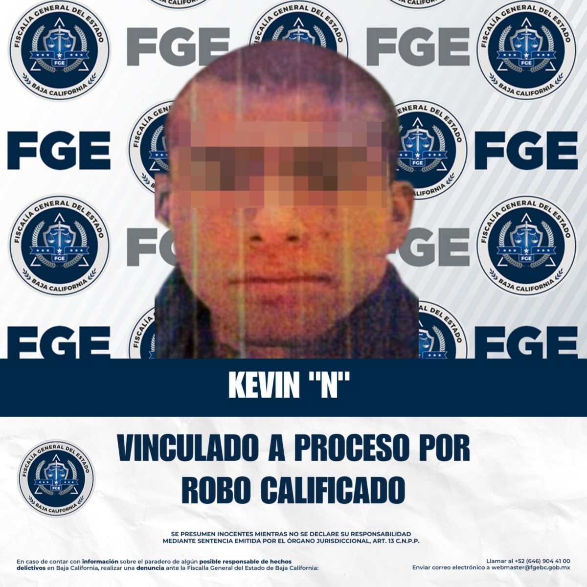 TIJUANA, BAJA CALIFORNIA. - La Fiscalía General del Estado, a través de la Fiscalía Regional de Tijuana y la Unidad de Investigación de Robos Mariano Matamoros, logró que un juez de control vinculara a proceso a Kevin “N” por el delito de robo calificado cometido en establecimiento comercial abierto al público, ejecutado con violencia, en perjuicio de una cadena comercial Oxxo.