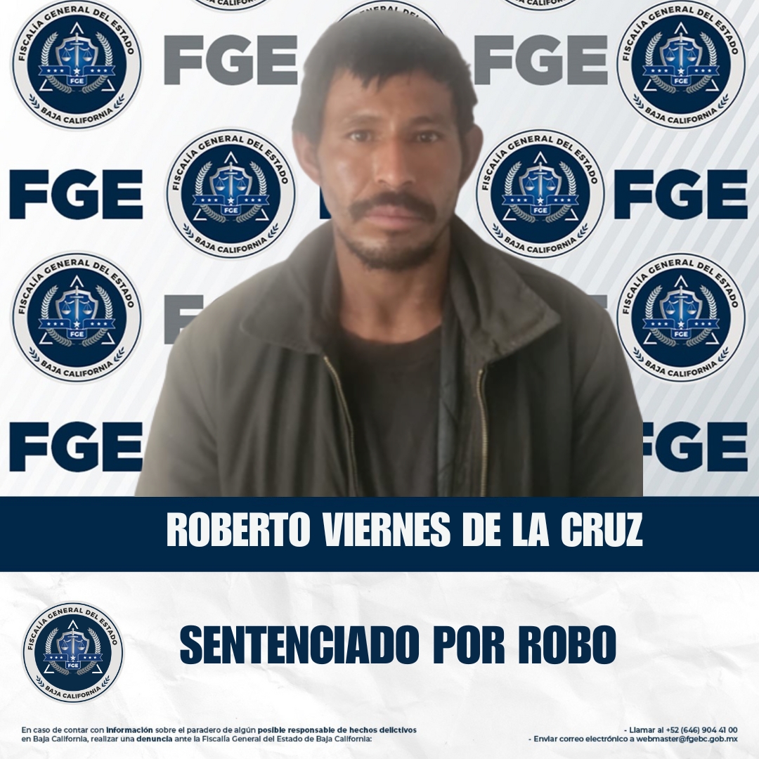 ENSENADA, BAJA CALIFORNIA. - La Fiscalía Regional de Ensenada, a través de la Unidad de Investigación de Robos, obtuvo una sentencia condenatoria de 5 años y 9 meses de prisión contra Roberto Viernes de la Cruz, por el delito de robo cometido en esta ciudad.