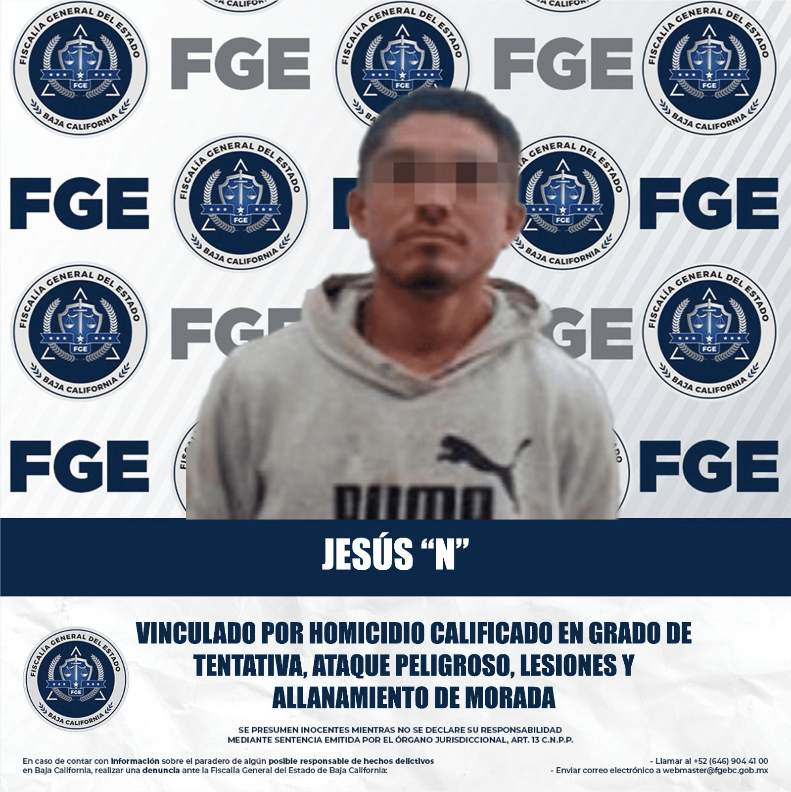 MEXICALI, BAJA CALIFORNIA. - La Fiscalía Regional de Mexicali, a través de la Unidad de Investigación de Delitos con Detenidos Poniente, obtuvo la vinculación a proceso de un individuo identificado como Jesús “N”, por su probable responsabilidad en los delitos de homicidio calificado en grado de tentativa, ataque peligroso, lesiones y allanamiento de morada.
