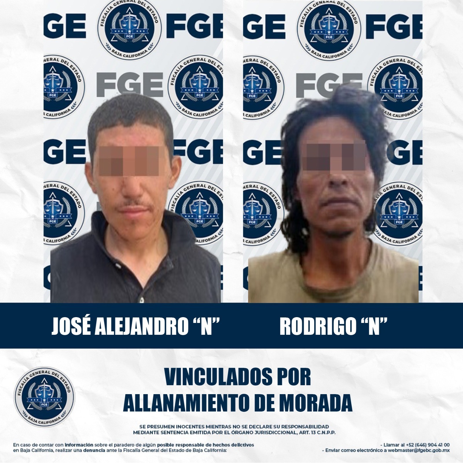 MEXICALI, BAJA CALIFORNIA. - La Fiscalía Regional de Mexicali, a través de la Unidad de Investigación de Delitos con Detenido Poniente, obtuvo la vinculación a proceso de dos hombres imputados por el delito de allanamiento de morada.