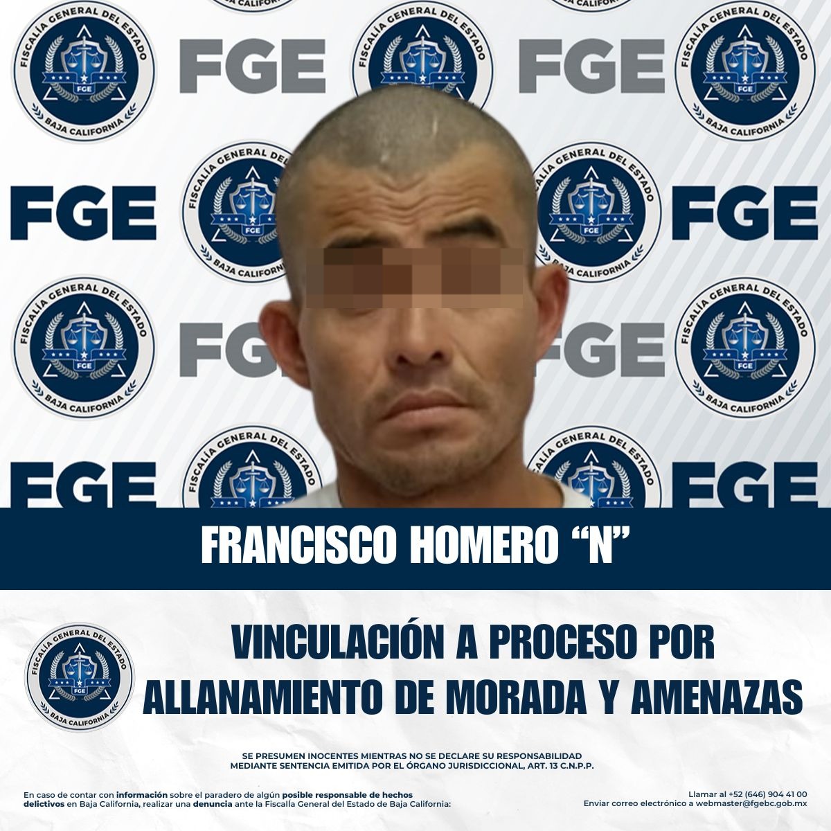 TIJUANA, BAJA CALIFORNIA. - La Unidad de Investigación con Detenido, adscrita a la Fiscalía Regional de Tijuana, obtuvo la vinculación a proceso y la medida cautelar de prisión preventiva justificada en contra de Francisco Homero “N”, por el delito de allanamiento de morada con violencia y amenazas.