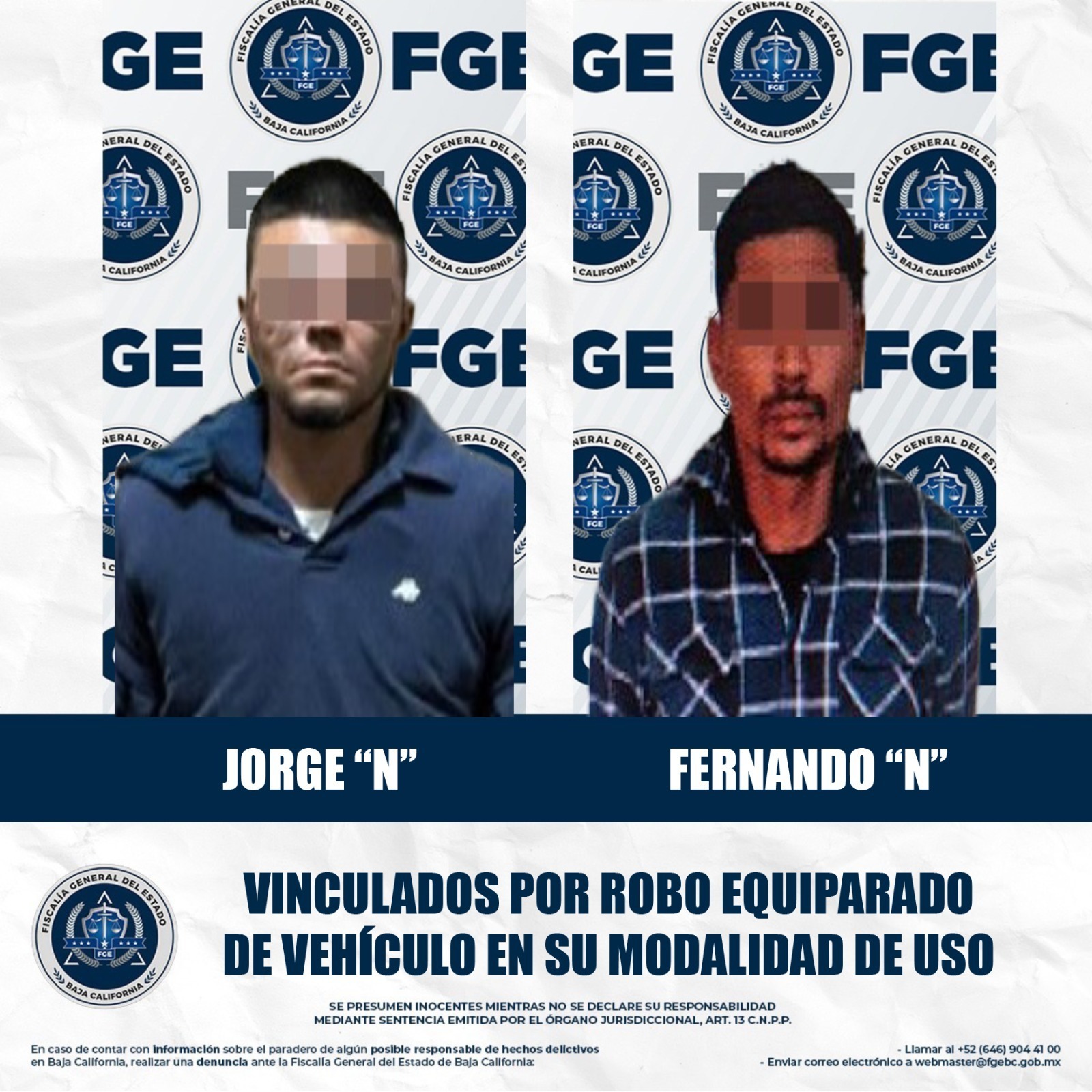 MEXICALI, BAJA CALIFORNIA. - La Fiscalía Regional de Mexicali, a través de la Unidad de Investigación de Delitos de Robo de Vehículo, obtuvo la vinculación a proceso de dos hombres imputados por el delito de robo equiparado de vehículo en su modalidad de uso.