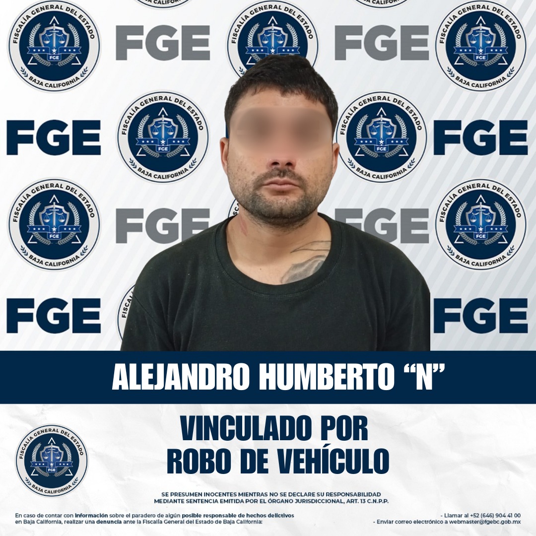 ENSENADA, BAJA CALIFORNIA. - La Fiscalía Regional de Ensenada, a través de la Unidad de Investigación de Robo de Vehículos, logró la vinculación a proceso de Alejandro Humberto “N”, por su probable participación en el delito de robo de vehículo.