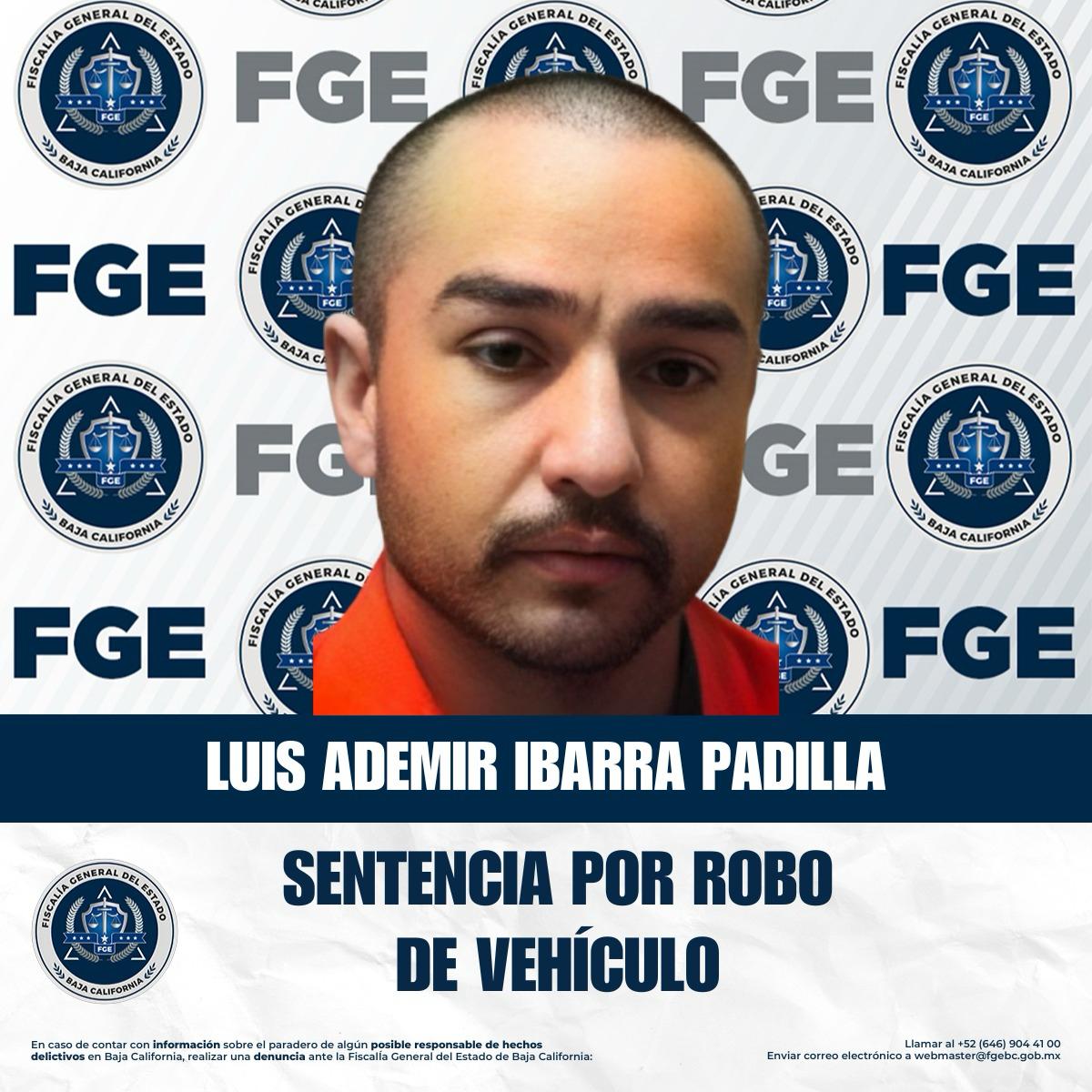 TIJUANA, BAJA CALIFORNIA. - La Fiscalía General del Estado, a través de la Unidad de Investigación Especializada en Robo de Vehículos Zona Tijuana, informa que Luis Ademir Ibarra Padilla ha sido condenado a cuatro años, cuatro meses y seis días de prisión por el delito de robo equiparado de vehículo de motor, en modalidad de uso, tras un procedimiento abreviado.
