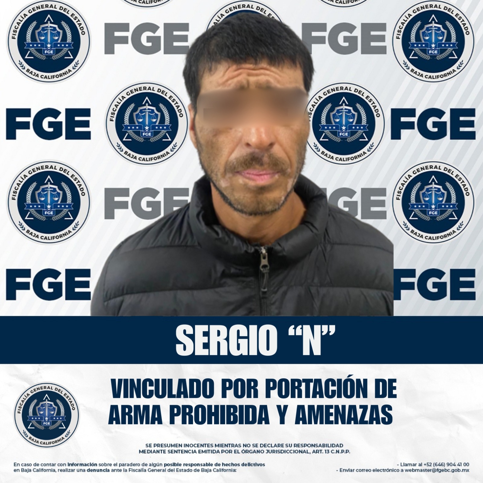 ENSENADA, BAJA CALIFORNIA. - La Fiscalía Regional de Ensenada, a través de la Unidad de Investigación con Detenido, obtuvo la vinculación a proceso de Sergio “N” por los delitos de portación de arma prohibida y amenazas.