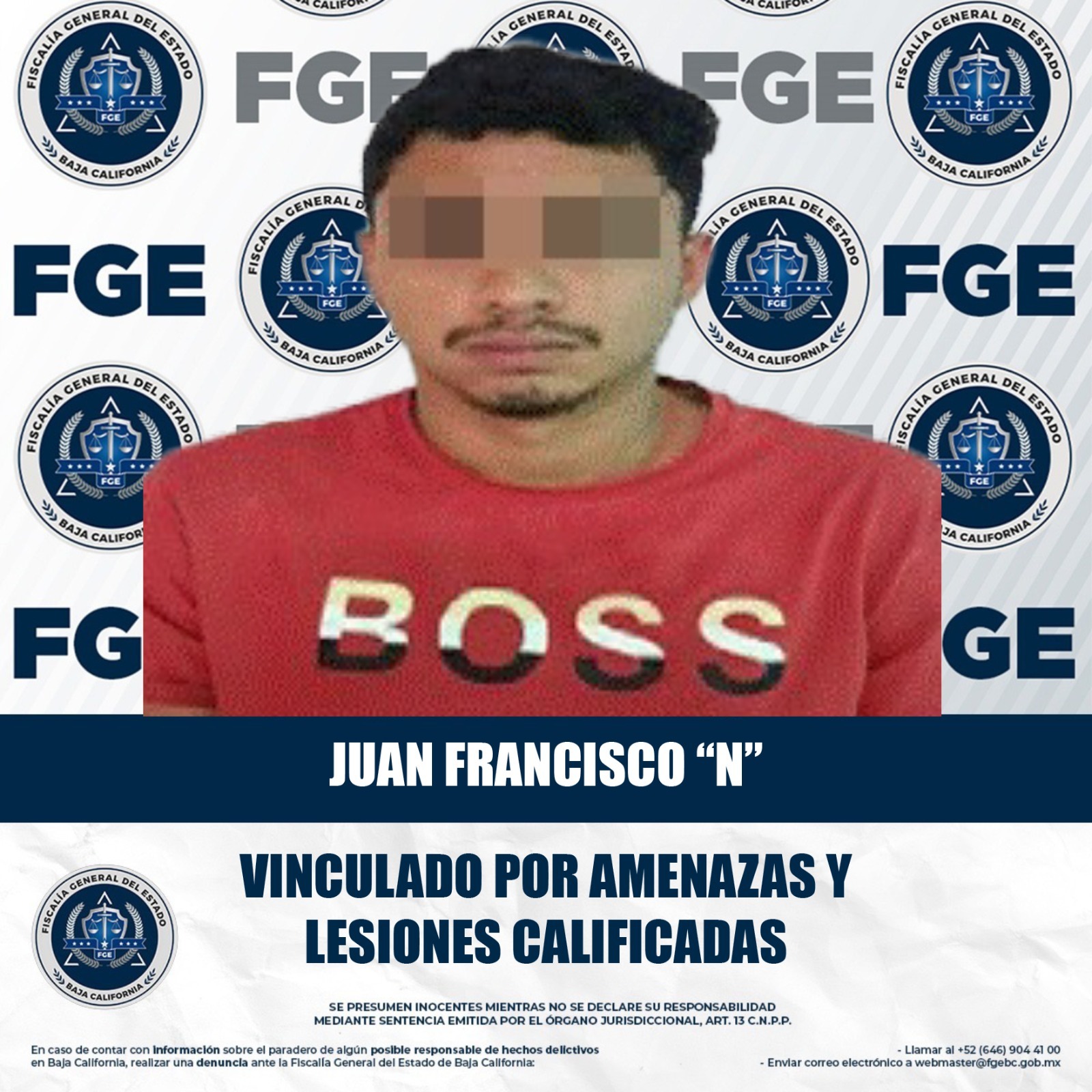 MEXICALI, BAJA CALIFORNIA. - La Fiscalía Regional de Mexicali, a través de la Unidad de Investigación de Delitos con Detenidos Oriente, obtuvo la vinculación a proceso de Juan Francisco “N”, por su presunta participación en los delitos de amenazas y lesiones calificadas.