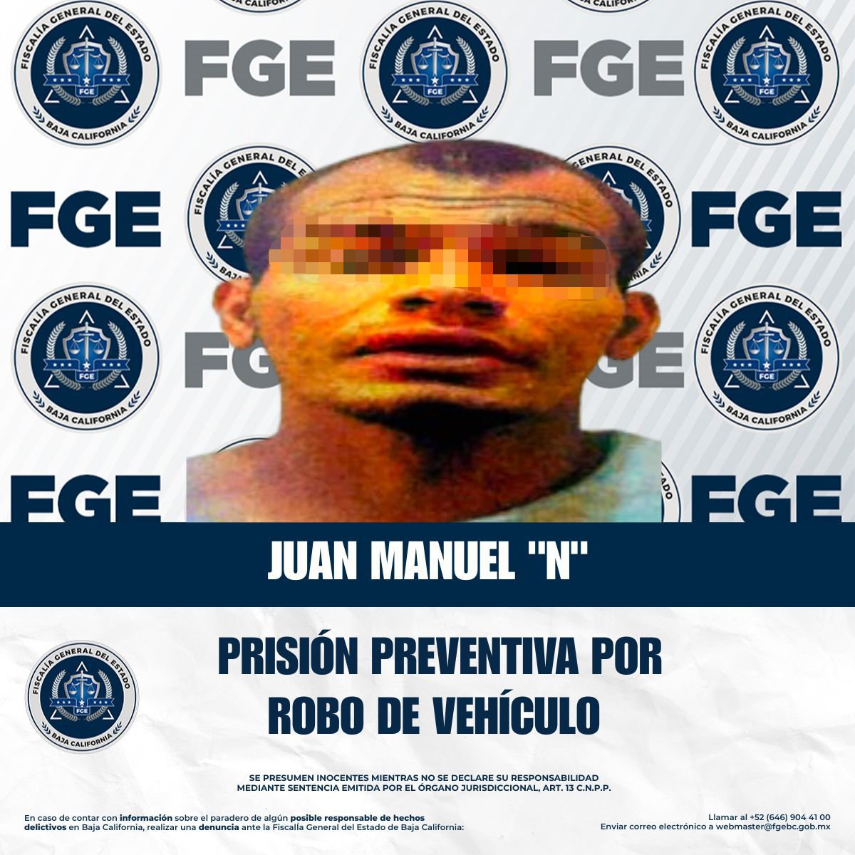 TIJUANA, BAJA CALIFORNIA. - La Fiscalía Regional de Tijuana, a través de la Unidad de Investigación de Robo de Vehículos, obtuvo la vinculación a proceso en contra de Juan Manuel “N”, por el delito de robo equiparado de vehículo de motor en la modalidad de poseer vehículo de motor robado.