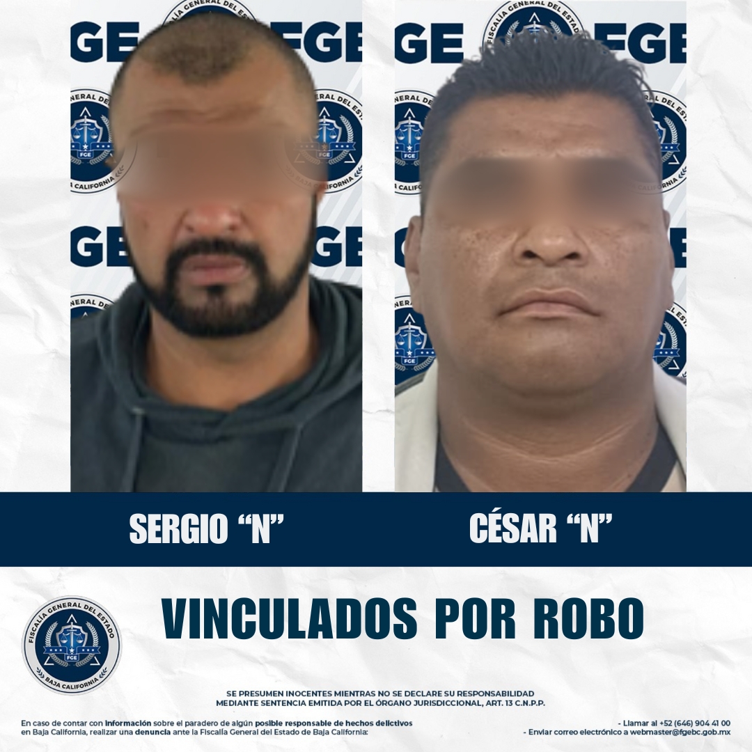 ENSENADA, BAJA CALIFORNIA. - La Fiscalía Regional de Ensenada, a través de las Unidades de Investigación de Francisco Zarco y de Robos, obtuvo la vinculación a proceso de dos hombres por los delitos de robo en grado de tentativa y robo de vehículo, en hechos ocurridos en distintos casos.