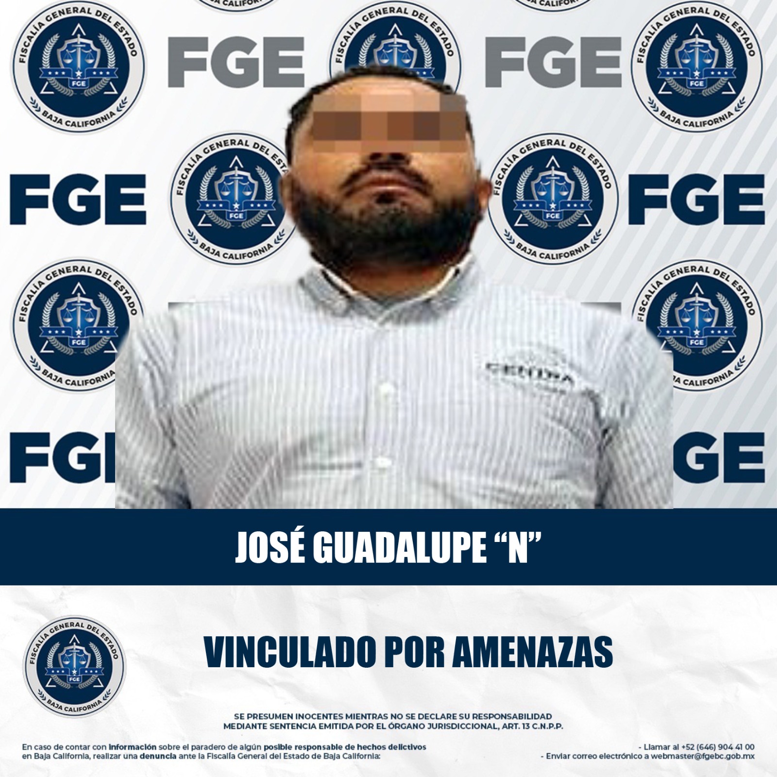 MEXICALI, BAJA CALIFORNIA. - La Fiscalía Regional de Mexicali, a través de la Unidad de Investigación de Delitos Contra las Personas y su Libertad, obtuvo la vinculación a proceso de José Guadalupe “N”, por su presunta responsabilidad en el delito de amenazas.
