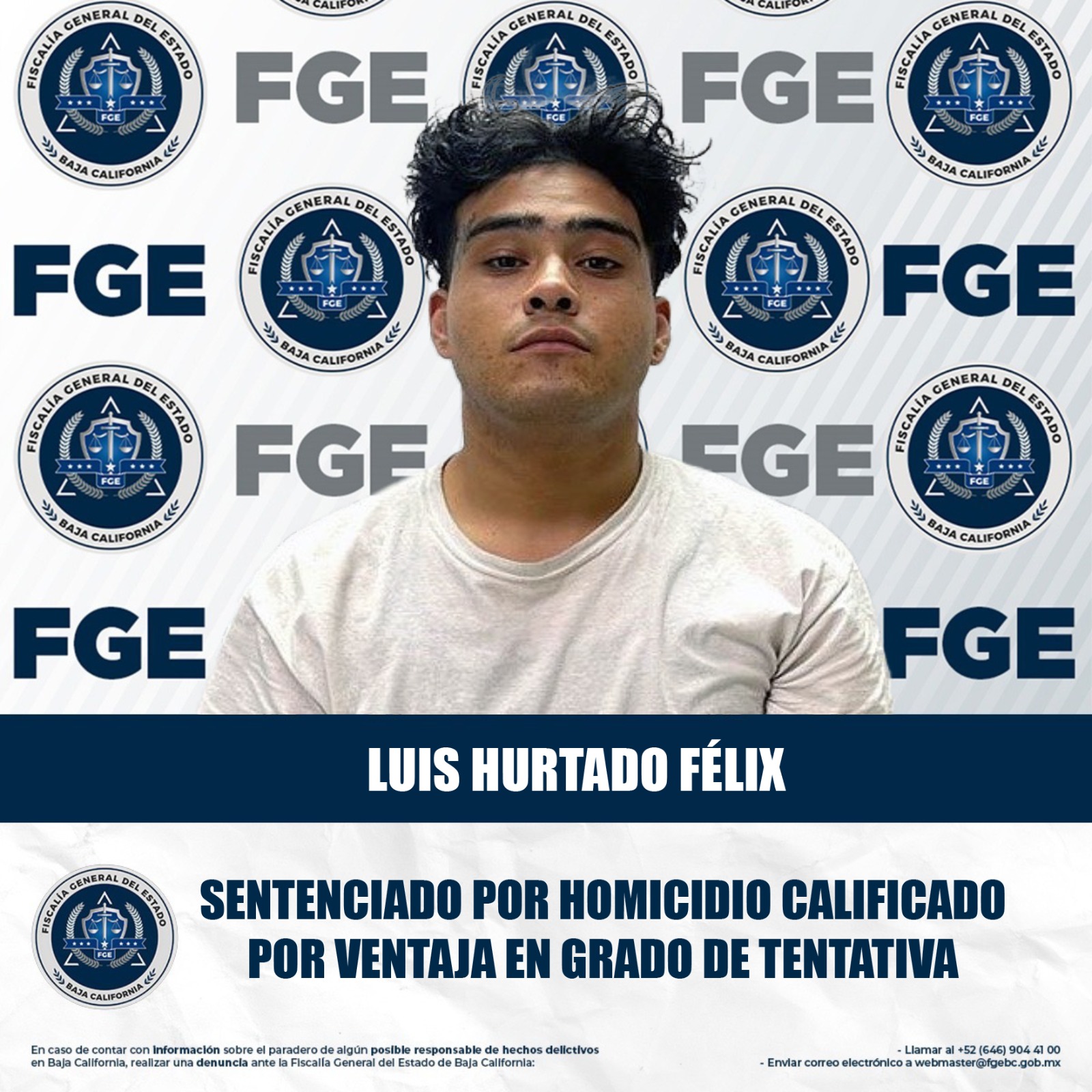 MEXICALI, BAJA CALIFORNIA. - La Fiscalía General del Estado, obtuvo una sentencia de 16 años y 8 meses de prisión en contra de Luis Hurtado Félix, alias “El Junior”, quien fue encontrado culpable del delito de homicidio calificado por ventaja en grado de tentativa.