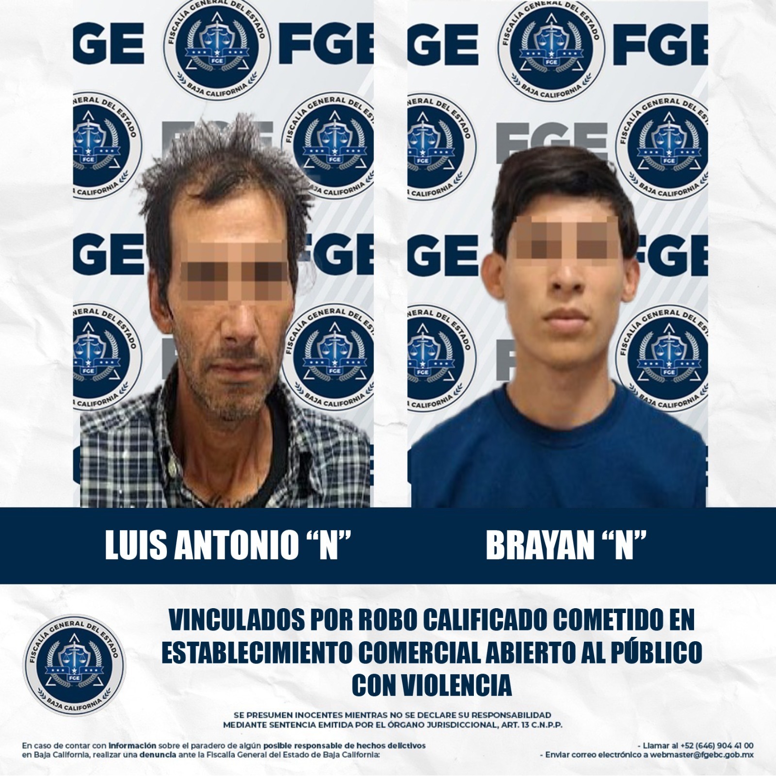 MEXICALI, BAJA CALIFORNIA. - La Fiscalía Regional de Mexicali, a través de la Unidad de Investigación de Delitos de Robo Poniente, obtuvo la vinculación a proceso de dos hombres imputados por el delito de robo calificado cometido en establecimiento comercial abierto al público con violencia.