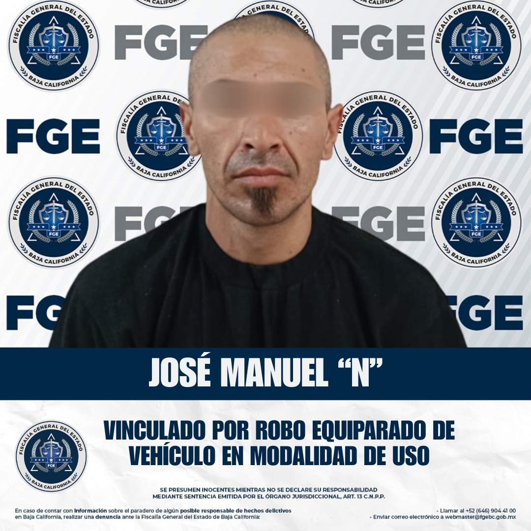 ENSENADA, BAJA CALIFORNIA. - La Fiscalía Regional de Ensenada, a través de la Unidad de Investigación de Robo de Vehículos, obtuvo la vinculación a proceso de José Manuel “N” por el delito de Robo Equiparado de Vehículo en Modalidad de Uso.