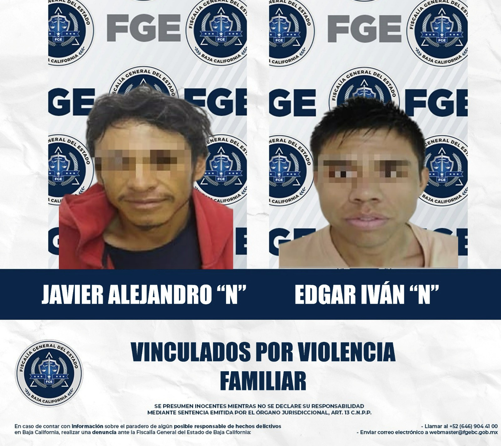 MEXICALI, BAJA CALIFORNIA. - La Fiscalía Regional de Mexicali obtuvo la vinculación a proceso de dos hombres por el delito de violencia familiar, en hechos atendidos en audiencias independientes.