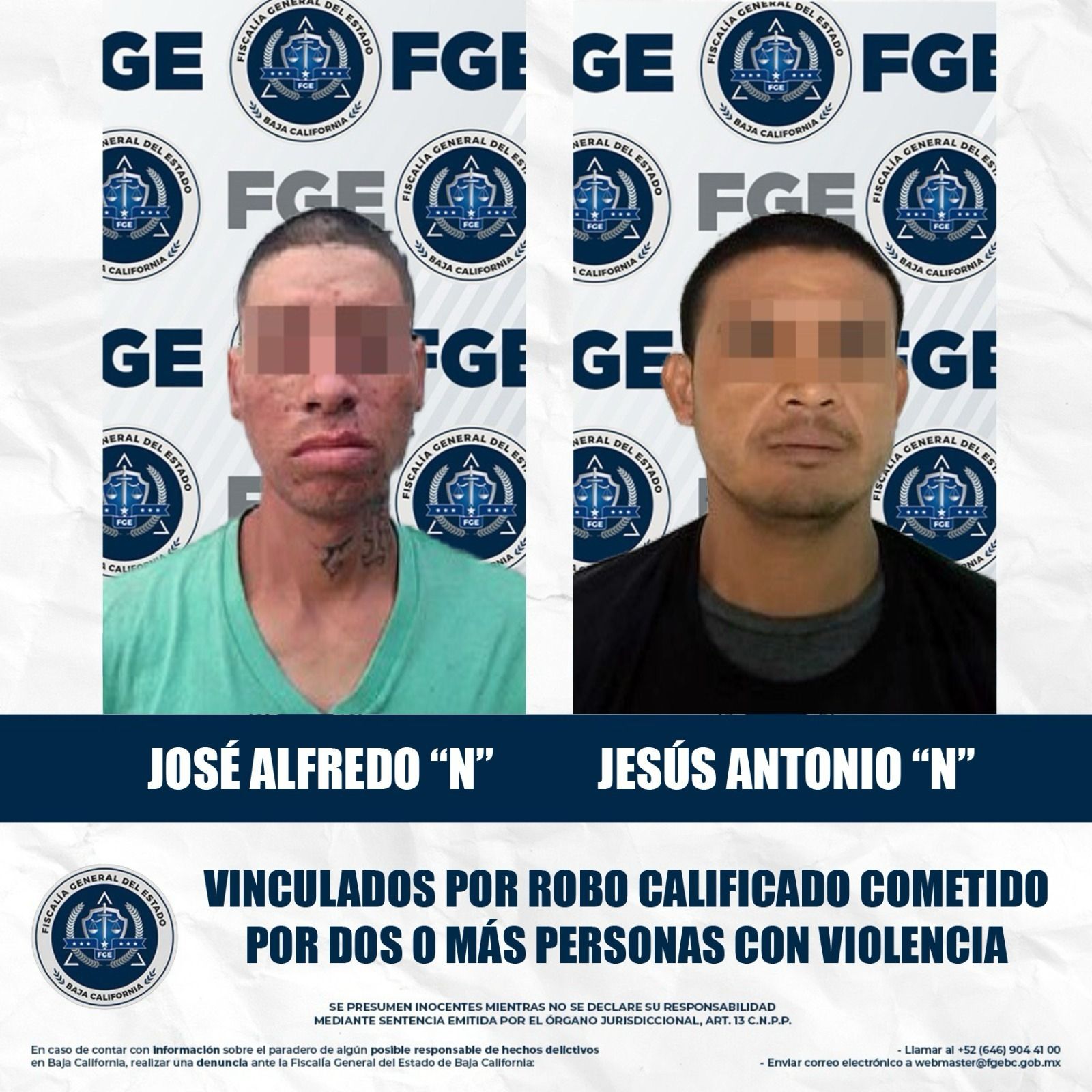 MEXICALI, BAJA CALIFORNIA. - La Fiscalía Regional de Mexicali, a través de la Unidad de Investigación de Delitos con Detenidos Poniente y Robo Poniente, obtuvo la vinculación a proceso de dos imputados por los delitos de robo calificado cometido por dos o más personas con violencia y robo calificado a establecimiento comercial abierto al público con violencia.