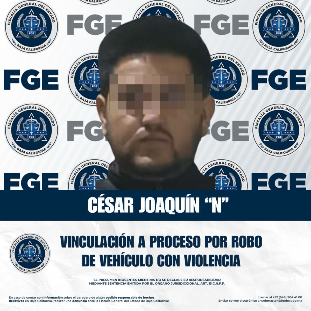 TIJUANA, BAJA CALIFORNIA. - La Fiscalía Regional de Tijuana, a través de la Unidad de Investigación de Robo de Vehículos, obtuvo la vinculación a proceso penal de César Joaquín “N”, por su probable responsabilidad en el delito de robo de vehículo con violencia.